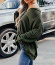 - It features a split v neck, banded long sleeves, and uneven hemlines