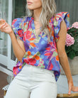 - The Split V Neck Flutter Floral Top boasts a beautiful and intricate floral pattern that is sure to catch the eye and make a statement