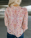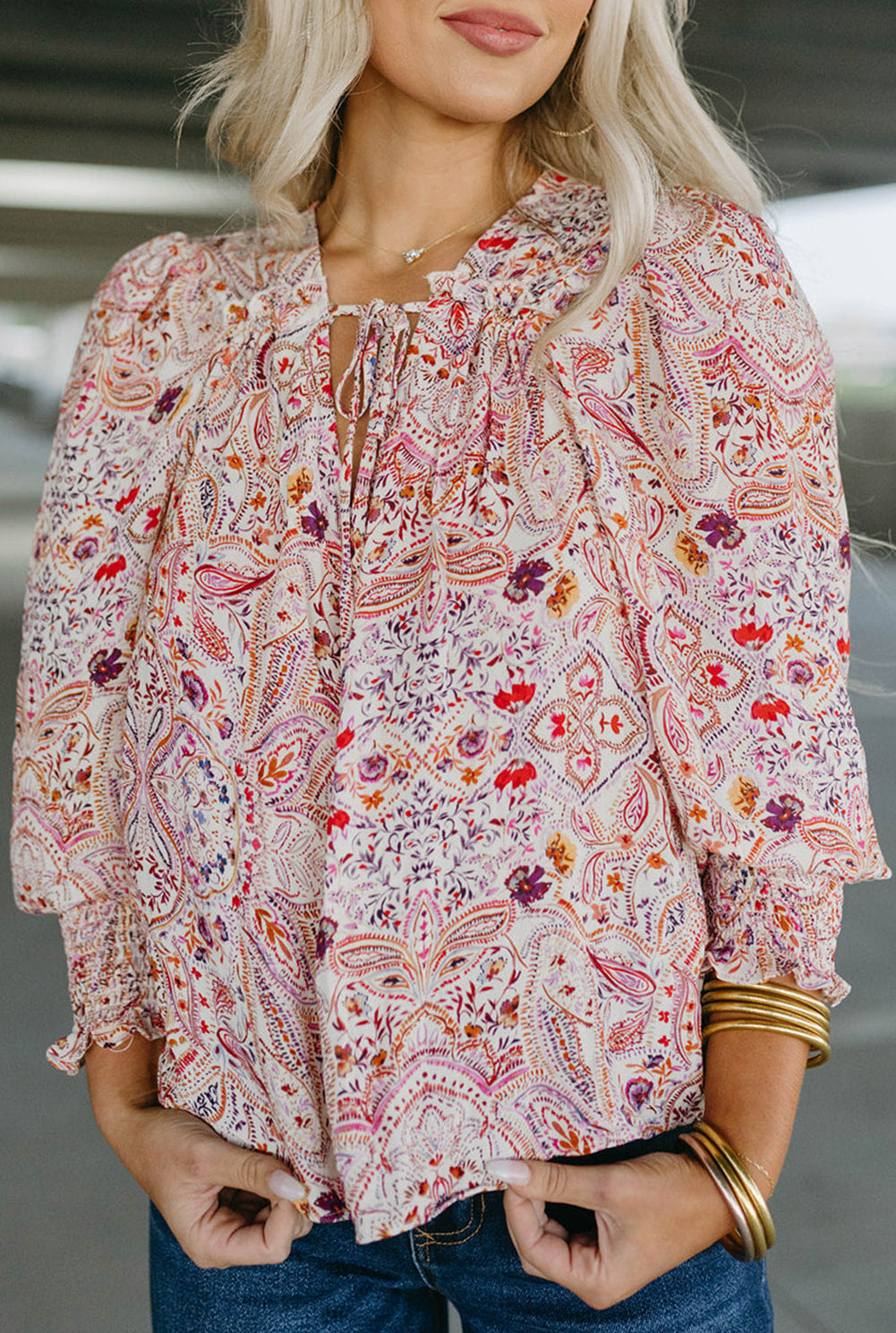 Red Vintage Boho Print Shirred Cuffs Blouse