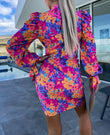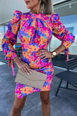 Floral Bow Tie Long Sleeve Mock Neck Ruched Dress