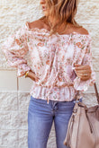 Pink Off The Shoulder Puff Sleeve Ruffled Floral Print Blouse